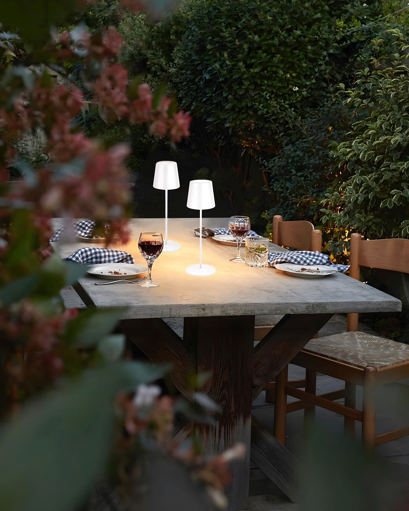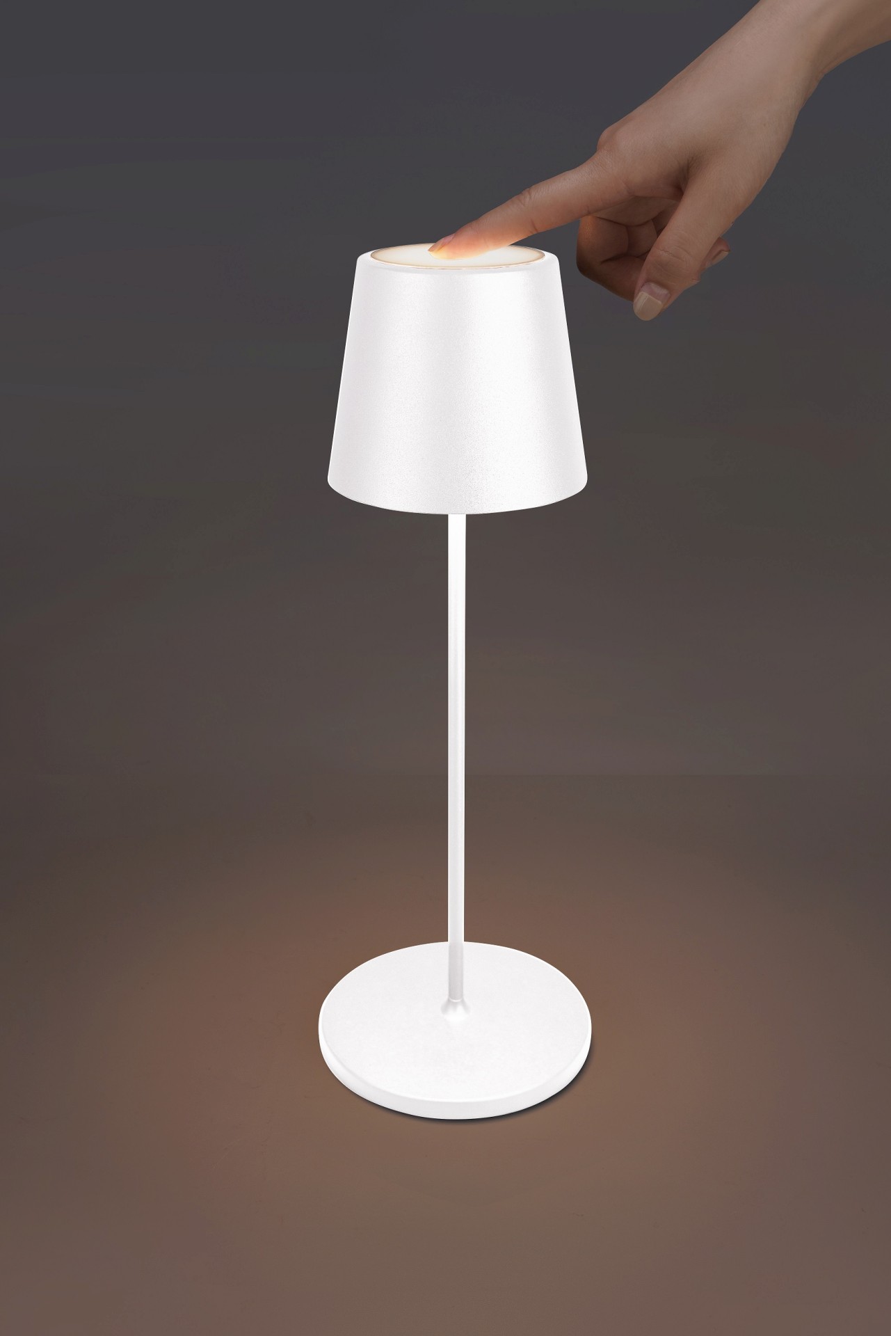 Pulverbeschichtete Leuchte aus Aluminium-Druckguss, Diffusor aus Polycarbonat. Dimmbares LED-Licht mit Akku-Betrieb, inklusive Ladestation.