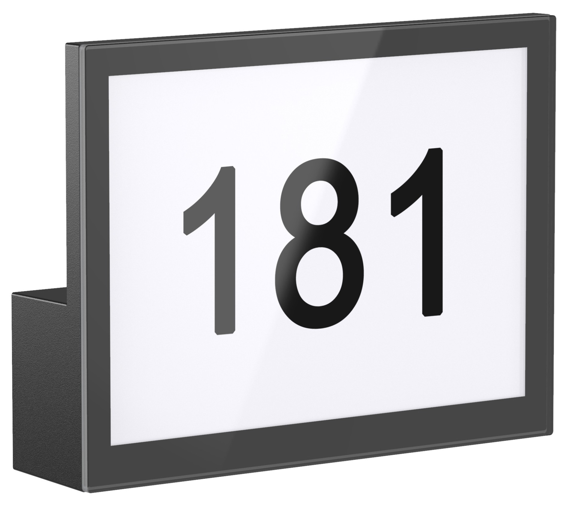 Pulverbeschichtete Leuchte aus Aluminium-Druckguss, Diffusor aus Glas. Inklusive LED-Leuchtmittel. 2 Kabeleingänge. Hausnummern als Zubehör verfügbar.